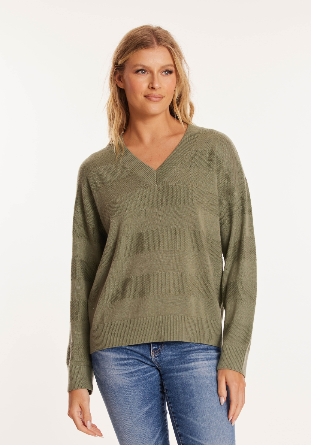 3/4 Sleeve V-Neck Texture Sweater in Fennel
