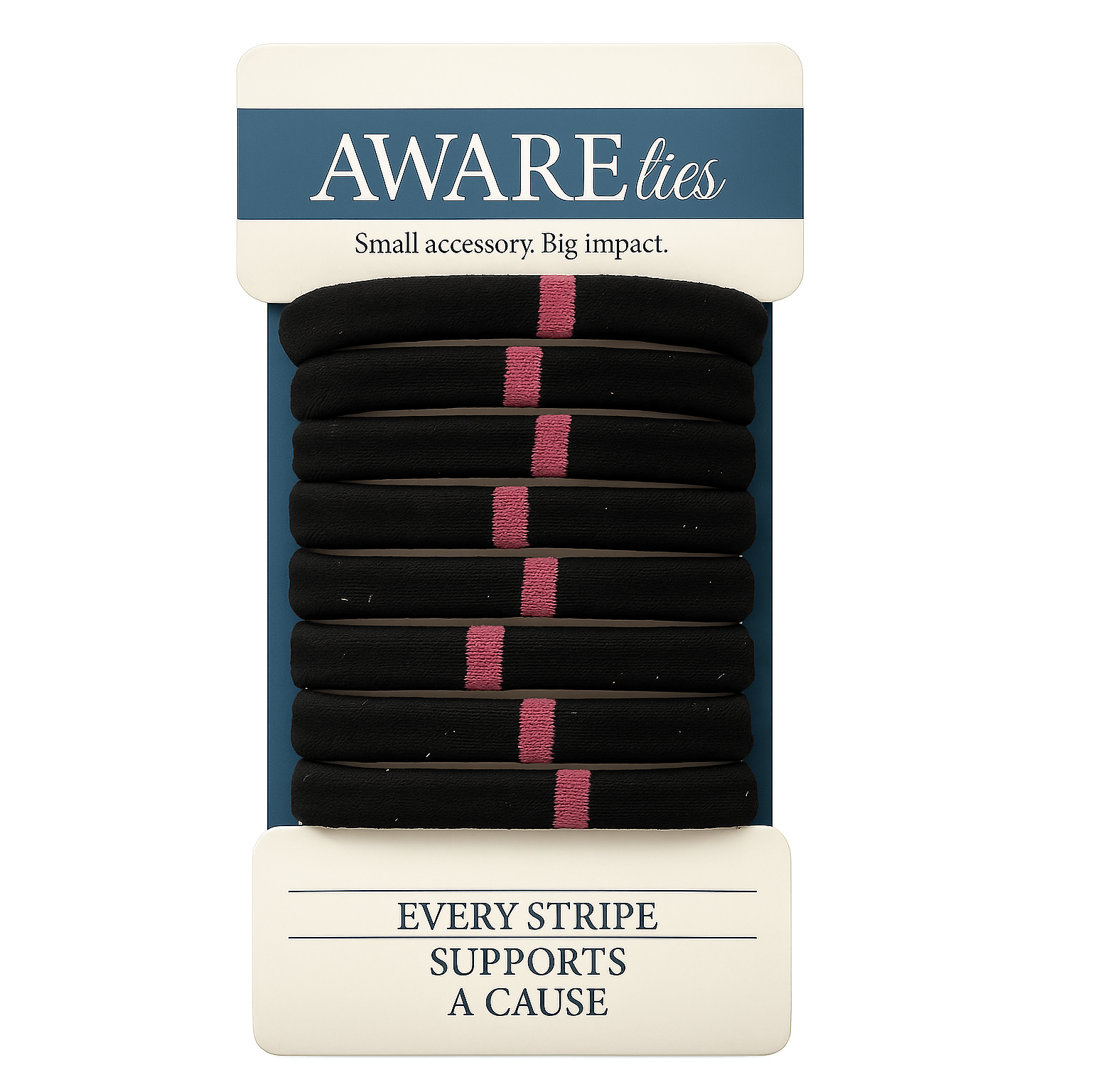 Show your support and spread awareness with the Pink Stripe AWAREties — our signature nylon hair ties designed to give back while holding strong. Each pack includes ten durable, no-snag ties that keep your hair secure all day without pulling, breaking, or stretching out.