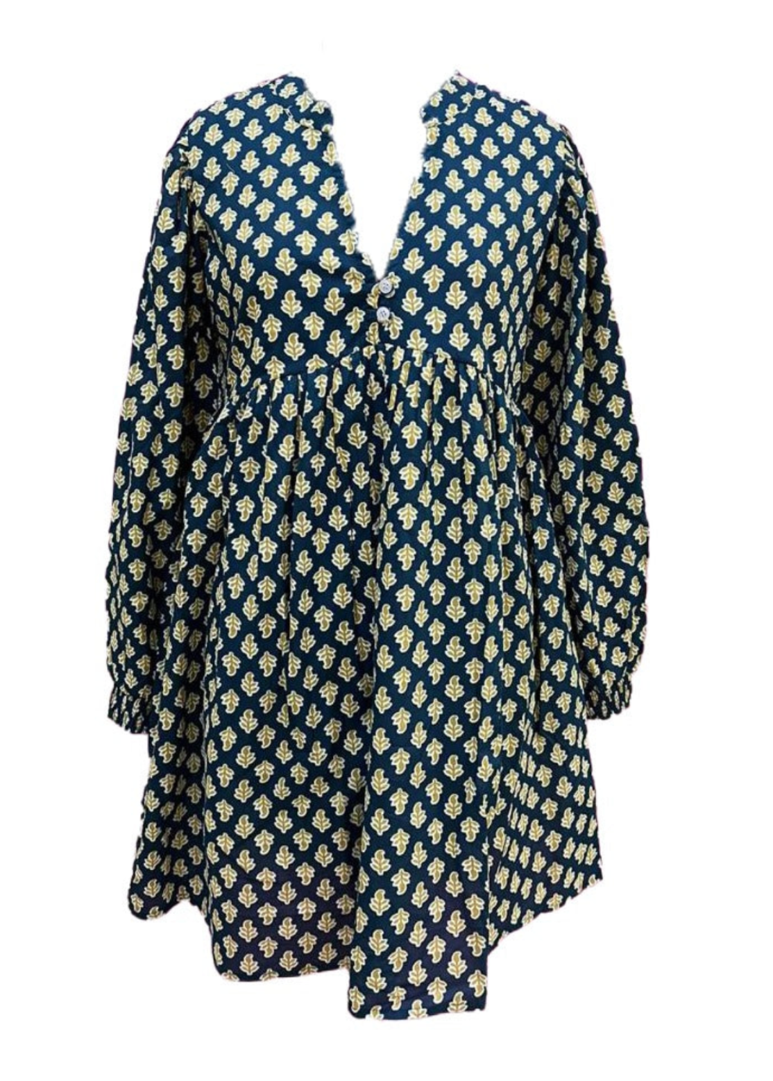 The Fern is our new go-to everyday mini. It features a V-neckline with a double button closure and full length balloon sleeves. Celebrating generational craftsmanship with prints that have been on India market for generations.