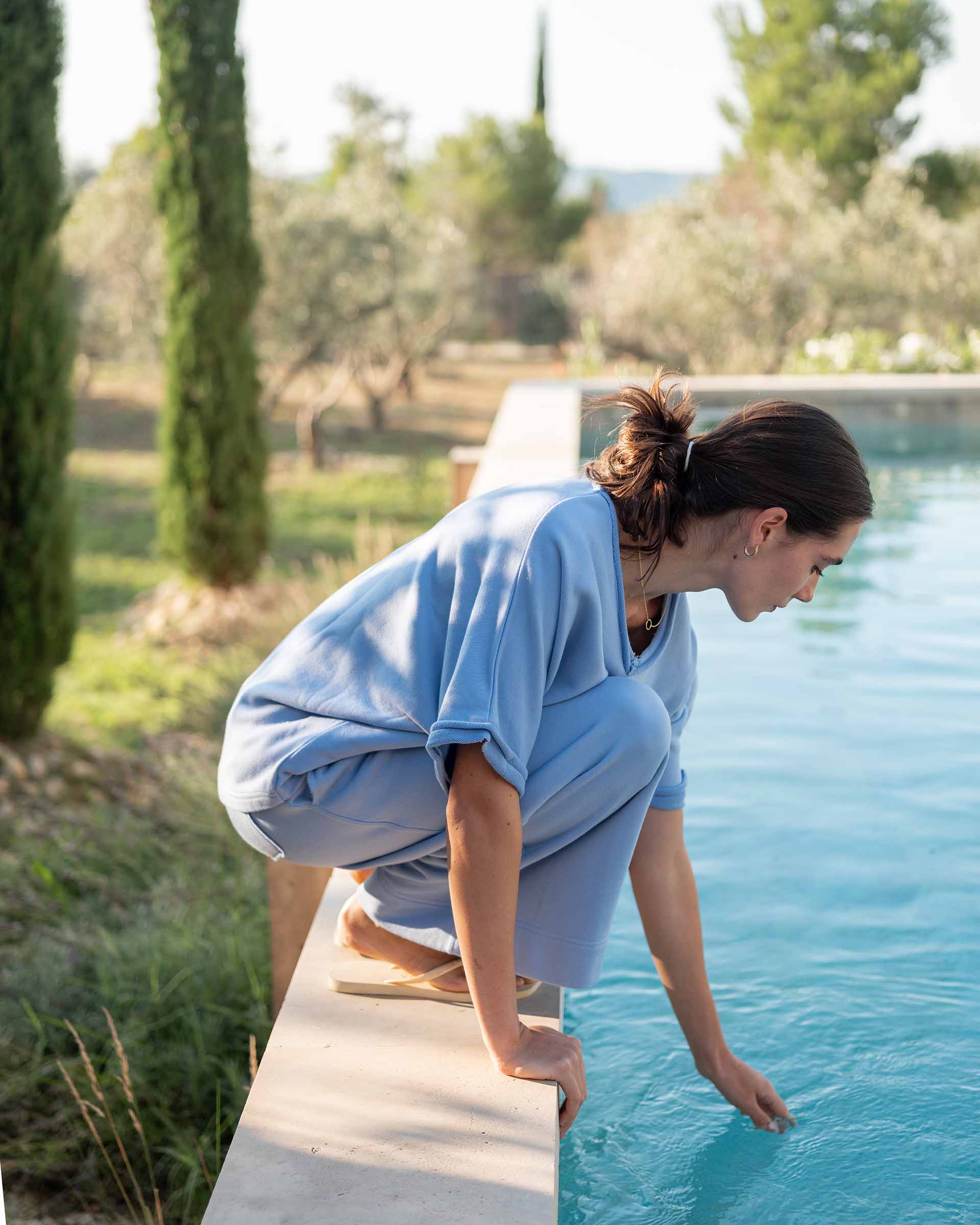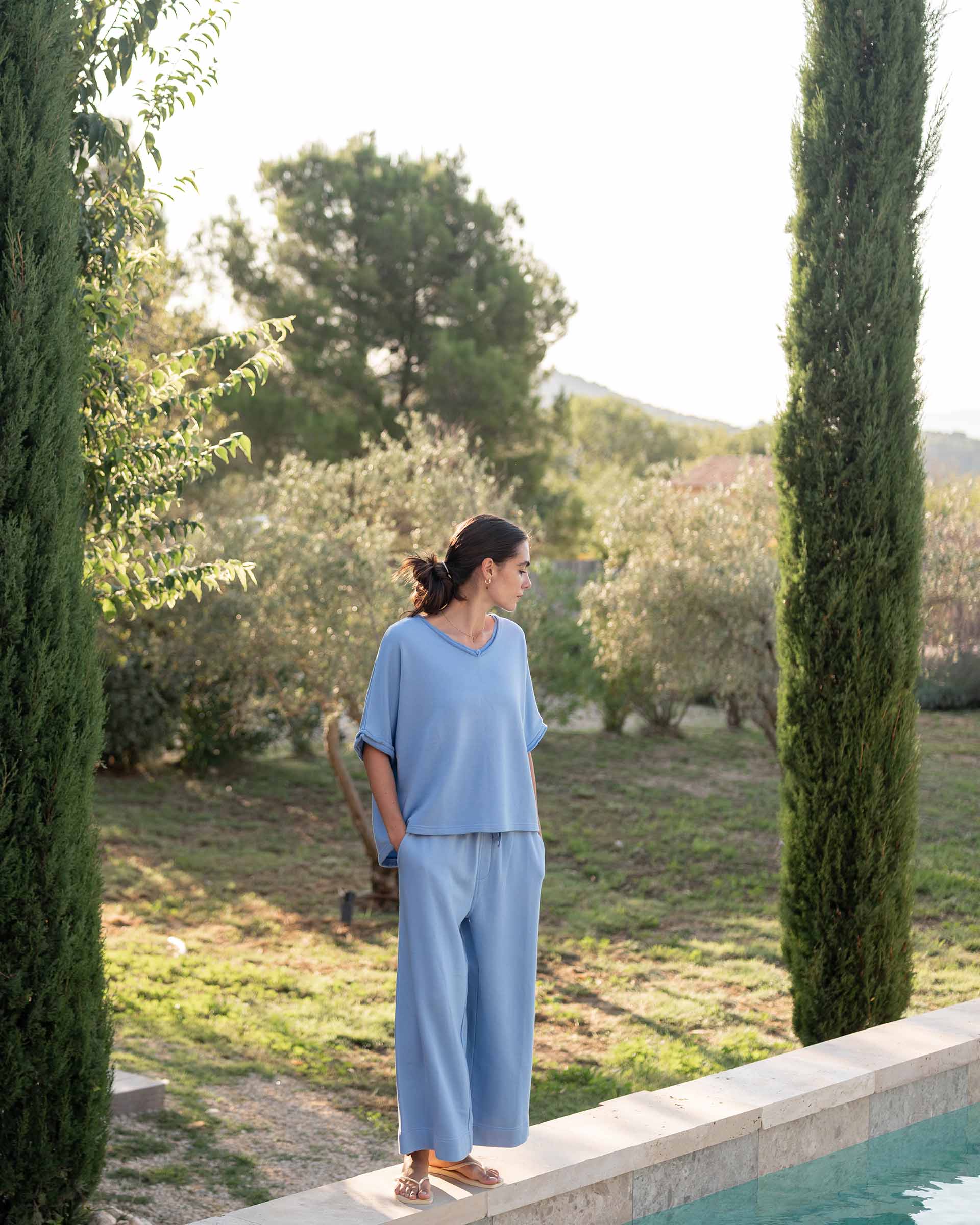Frenchie Raw Edge V-Neck Sweatshirt in Periwinkle Blue