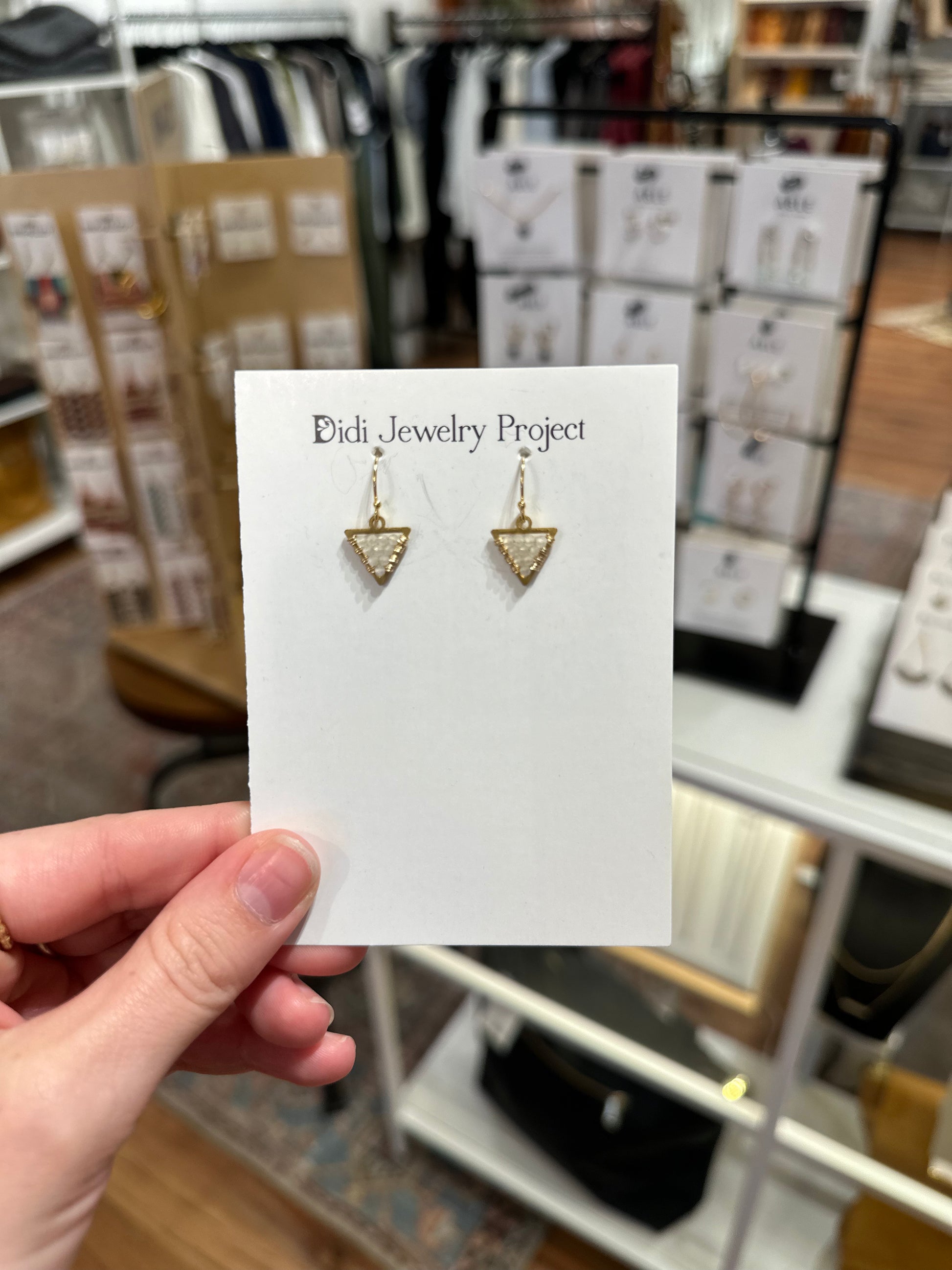 These beautiful stone triangle earrings really show off the radiant colors of each stone. Three small stone triangles really make a delicate statement. They are light weight and sophisticated.