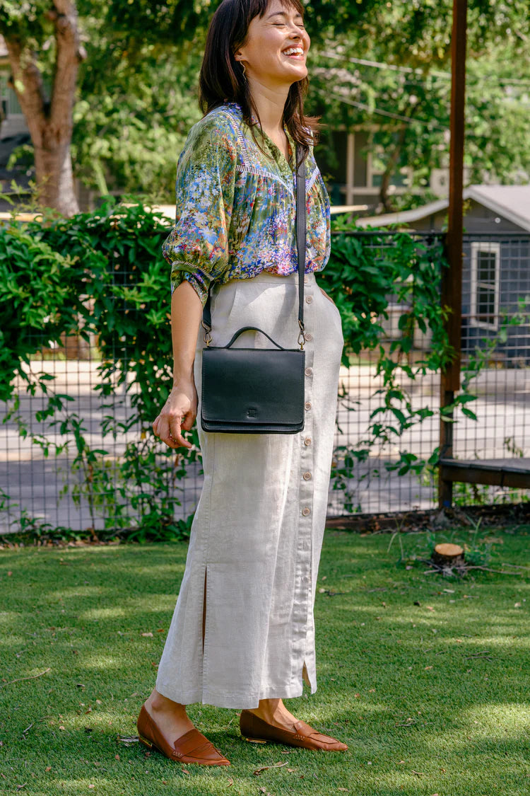 Designed for everyday ease, our Small Crossbody is compact without compromising on function. With three interior compartments (two open and one secure zippered divider), it keeps your essentials neatly organized while still feeling light and effortless. The removable, adjustable strap allows you to wear it your way — as a crossbody, shoulder bag, or carried by the top handle. Finished with antique brass hardware for a timeless touch, this piece blends classic design with everyday versatility.