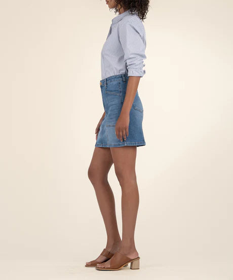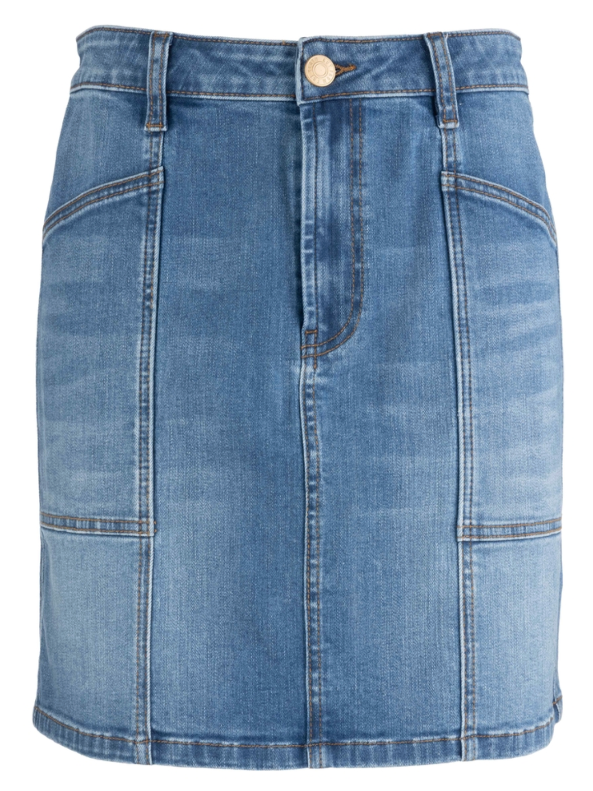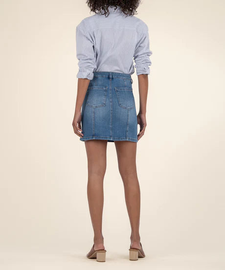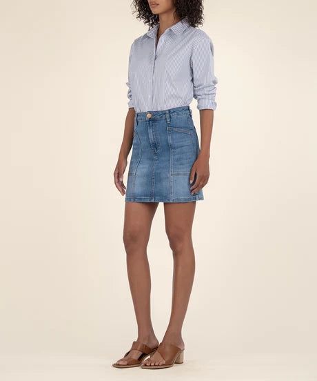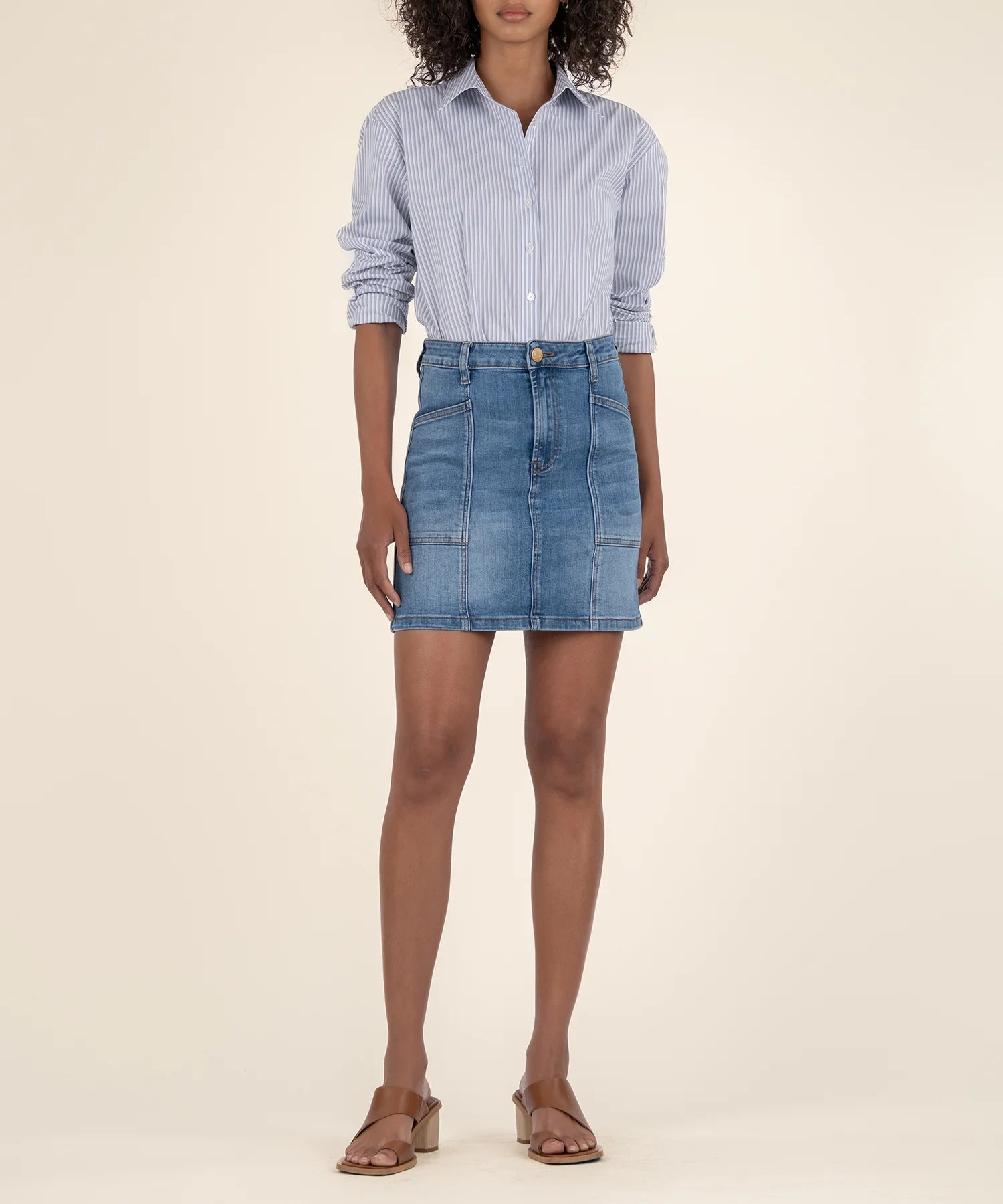 This above-knee length skirt effortlessly combines style and functionality. With a chic front seam for a touch of flair and back slash patch pockets for added practicality, it’s the perfect mix of trendy and versatile. Whether paired with a casual tee or dressed up for a night out, this skirt offers a flattering fit that works for any occasion.