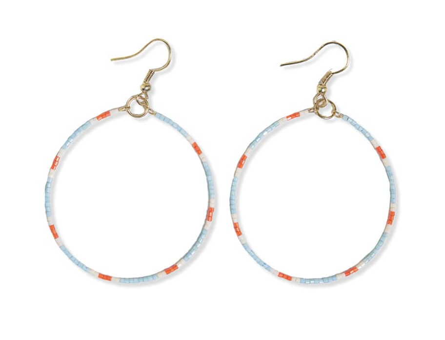 Complimentary colors are a girl's best friend. Lightweight, dainty, and impactful, these front-facing hoops are what everyday earring dreams are made of. This slender silhouette of glass beads in light blue, coral, and white create a look that's perfectly minimal, yet daring.