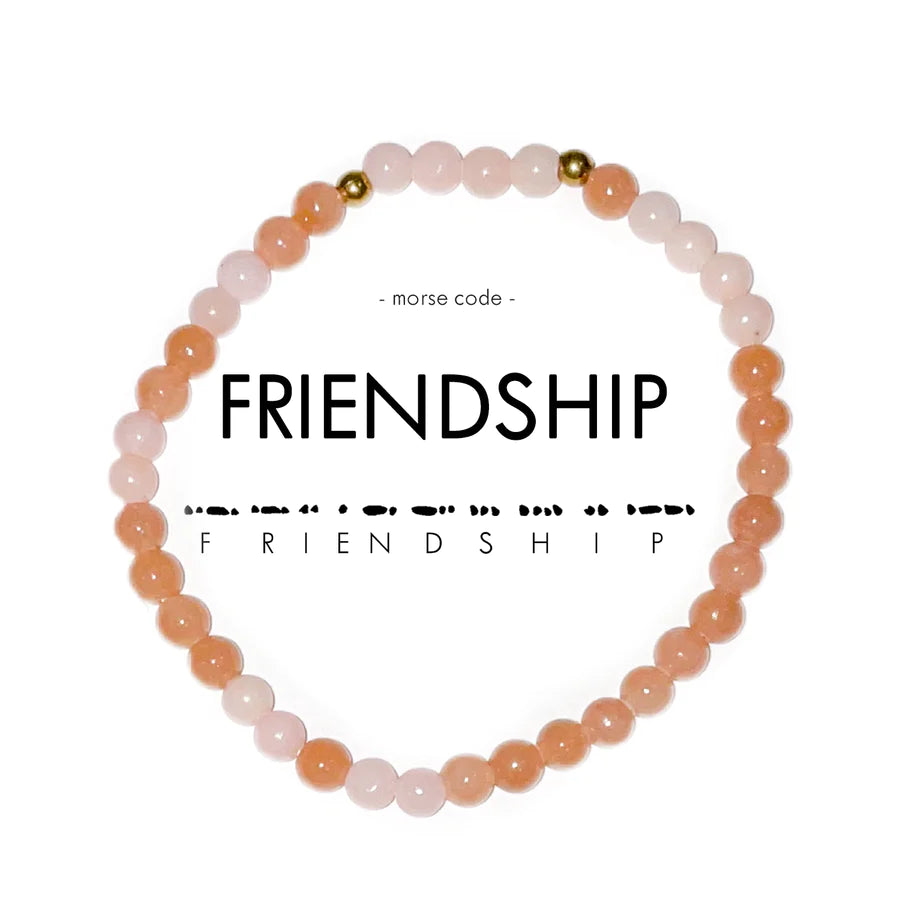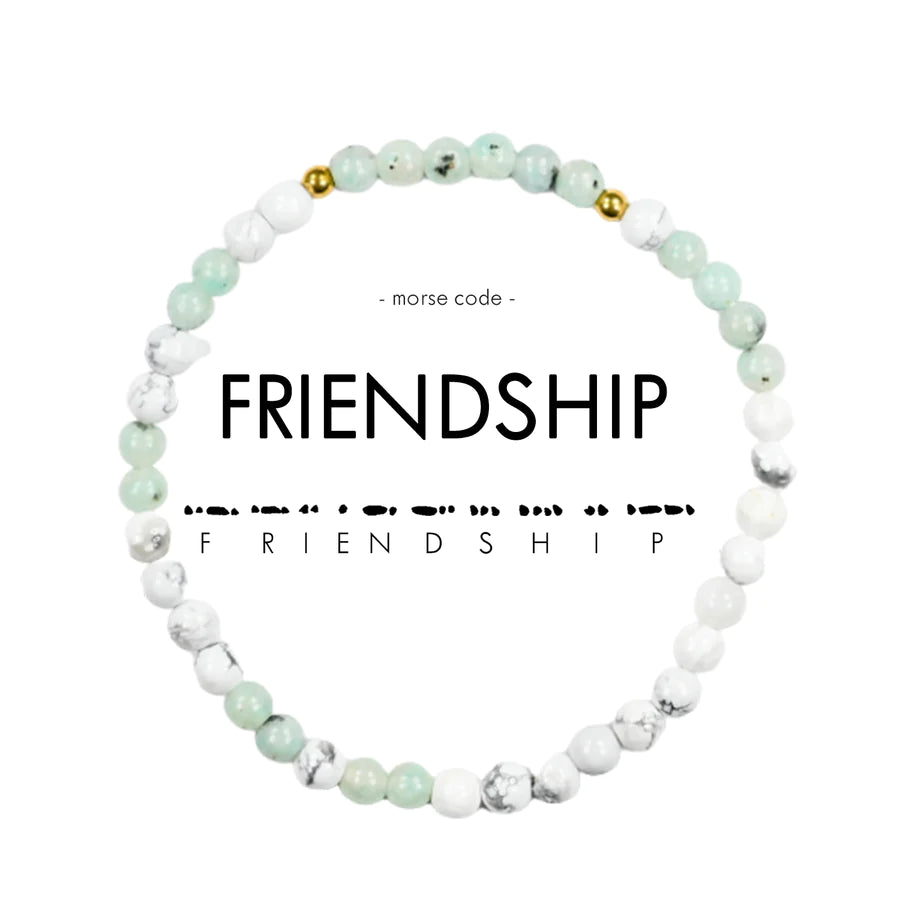 How to read your jewelry: A Morse Code dot is one bead and a dash is two beads in the alternating color. Start at the small gold spacer bead and follow the Morse Code spelling around the bracelet!