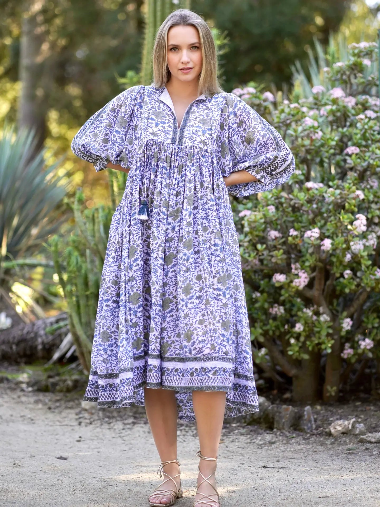 A flowy, soft cotton dress- hand made using the traditional method of hand block printing. A dreamy dress w/ billowing sleeves and front tie detailing. The dress is unlined making it soft and lightweight.