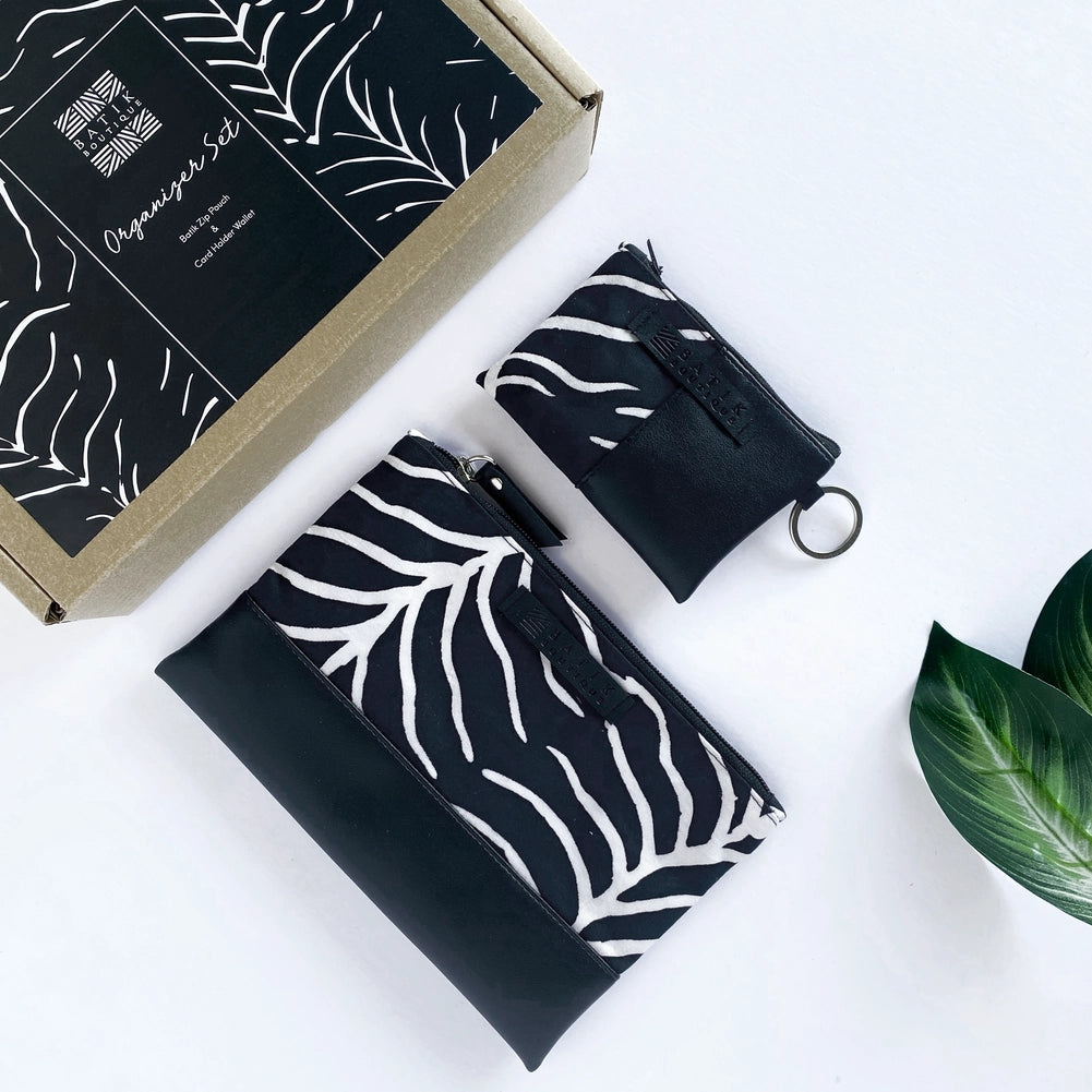 The zip pouch is 100% cotton, hand-blocked Malaysian batik. The bottom of the zip pouch is made of durable PU leather, and there’s a cotton lining inside to protect your items.