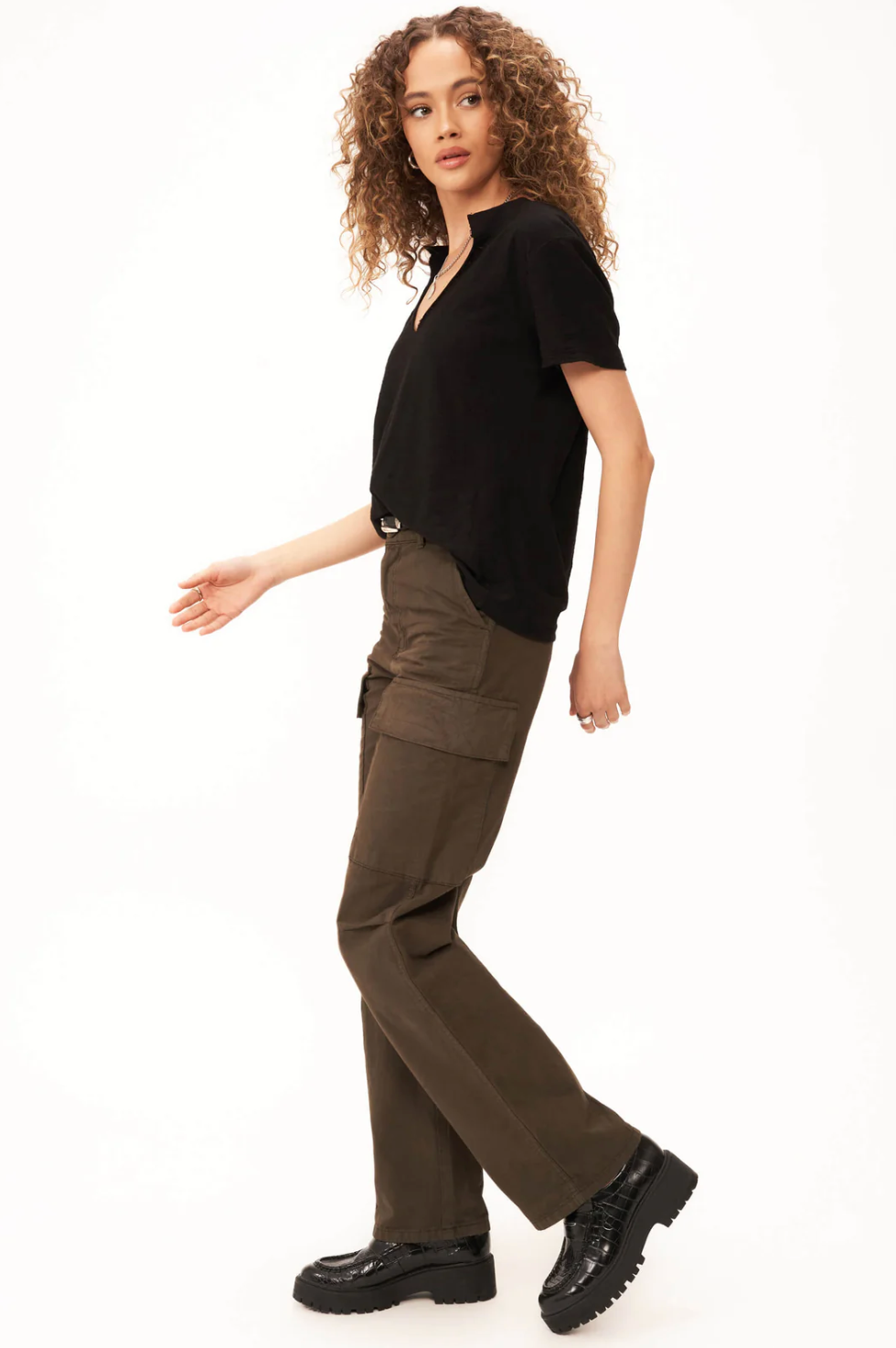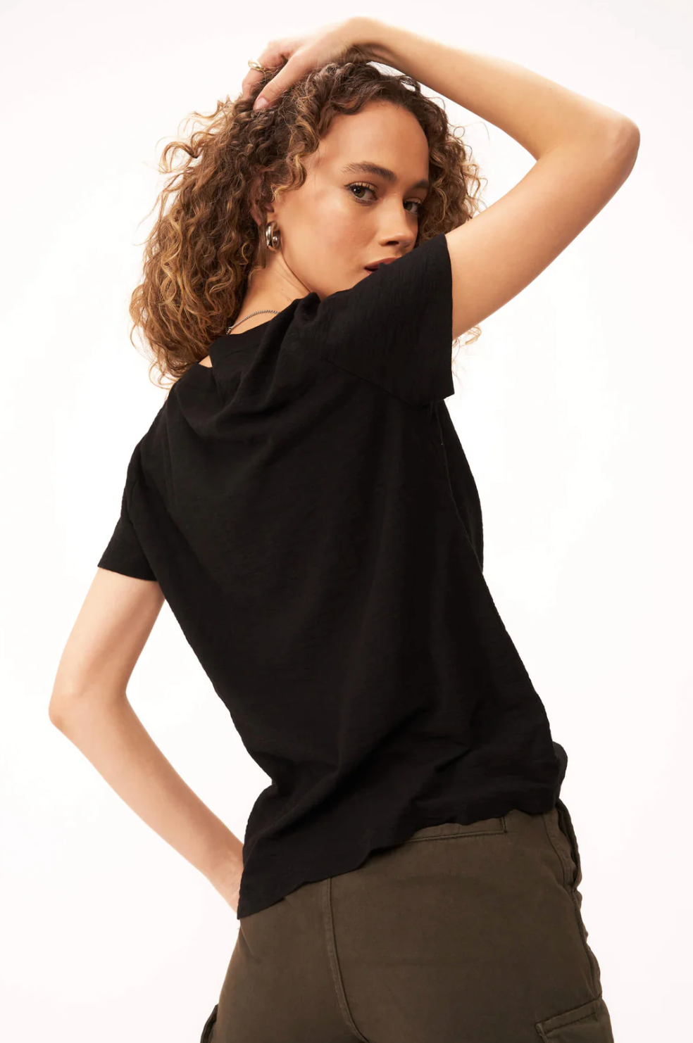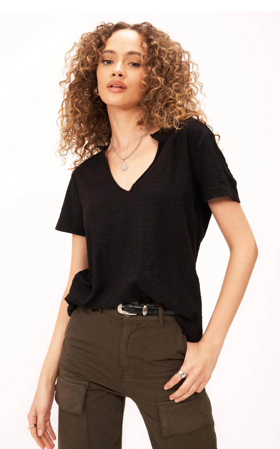 Our Plata Notched Tee features a notch neckline with raw edges and a gentle slim fit, giving it a well-loved, vintage feel. The perfect complement to a "tee and jeans" type of day with sneakers or night with heels.