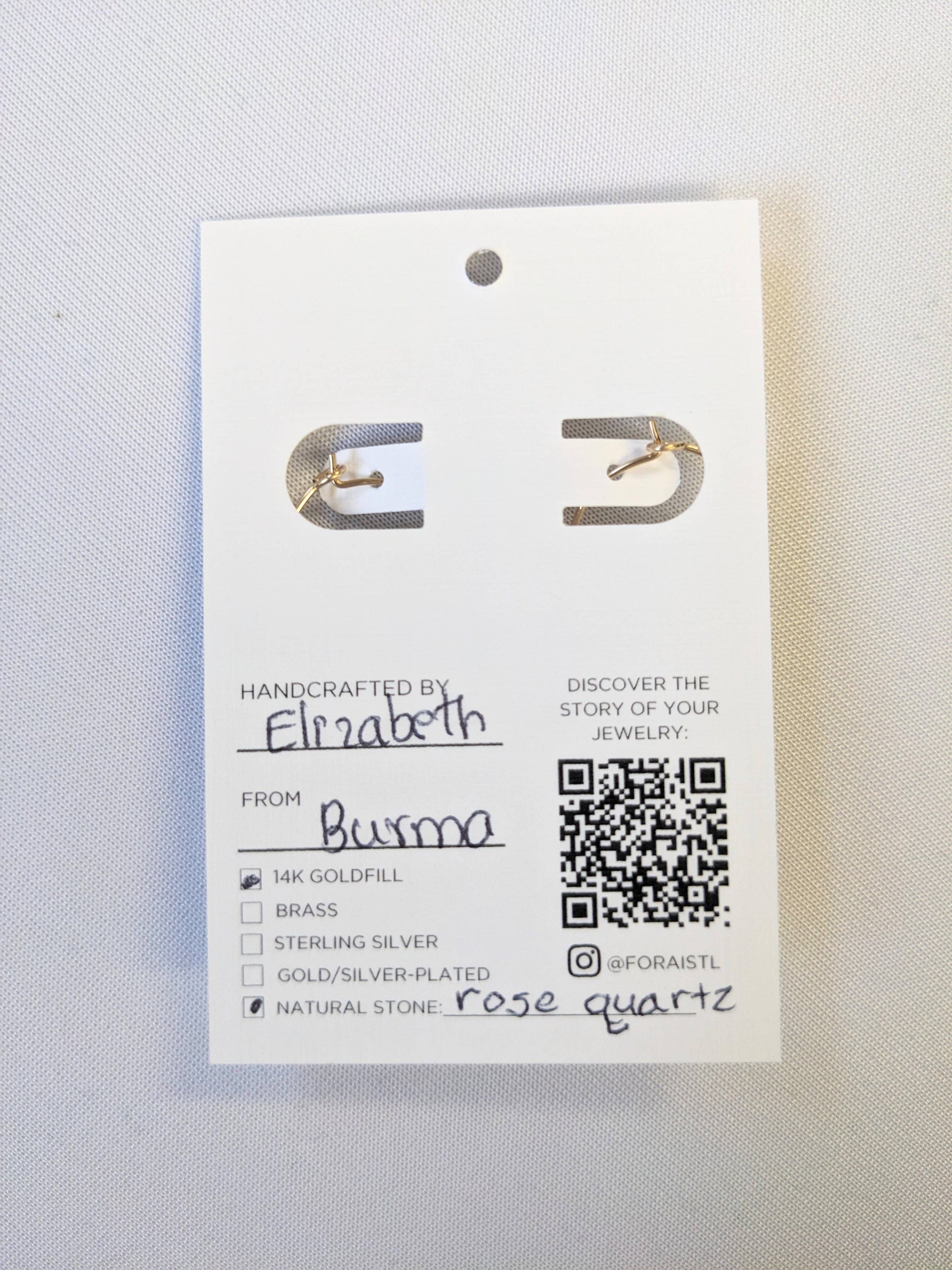 SUSTAINABILITY AND VALUES: Women-founded and run brand. Designed by an all-female team in St. Louis, MO. Hand-crafted by fairly paid, resettled refugee and immigrant women in St. Louis, MO. CARE AND QUALITY: Store with jewelry of the same tone (silver with silver, gold with gold). Gently polish with a jewelry polishing cloth as needed.
