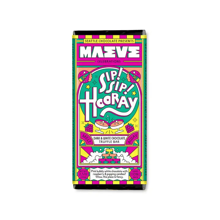 Pop! Fizz! Yum! This bar is ready for celebrating. Crafted using a dark chocolate shell and freeze-dried raspberries in white chocolate, it also adds all natural popping candy that tickle the palate like champagne bubbles. Non alcoholic.
