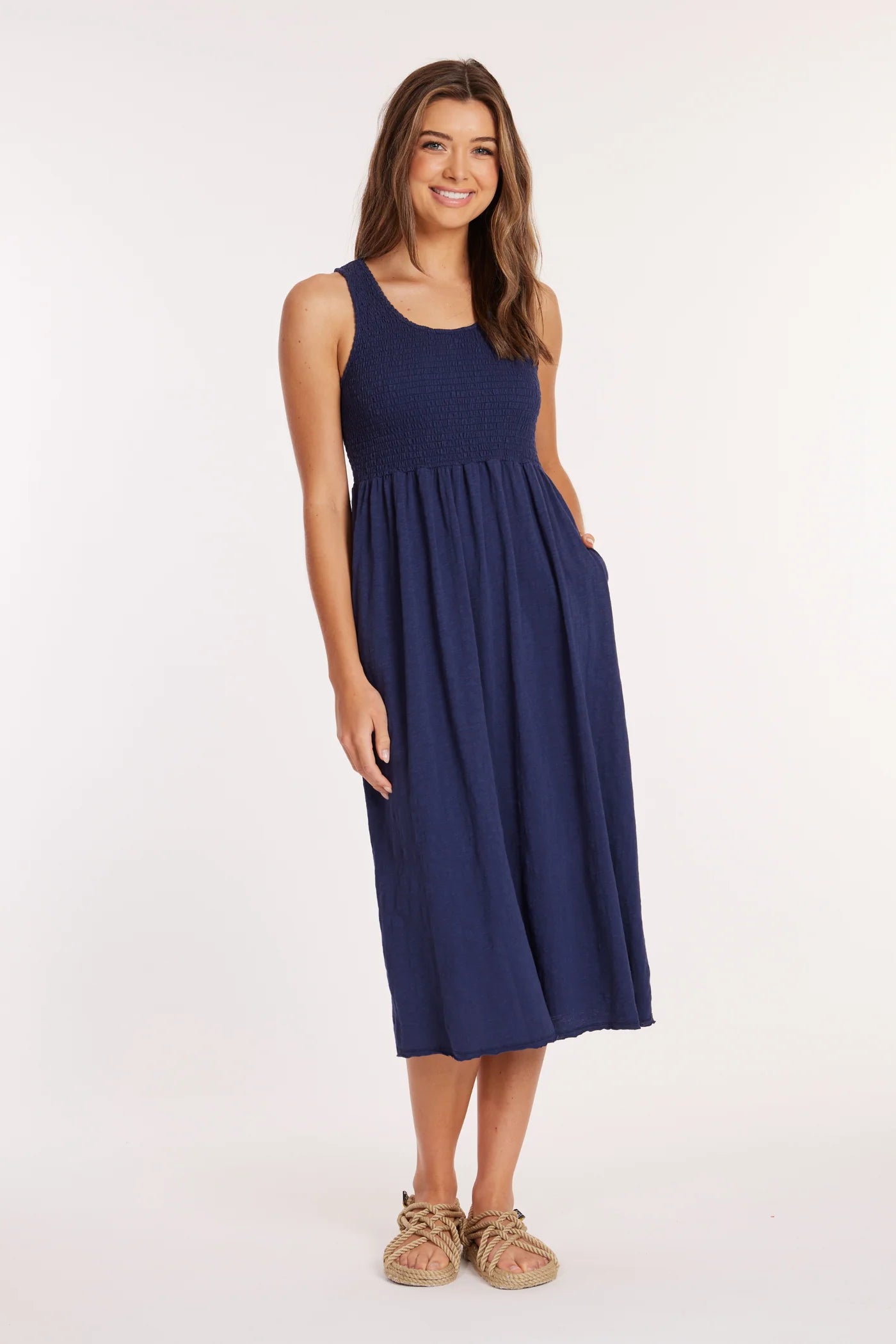 A warm-weather favorite that blends charm with comfort. This midi dress features a soft, stretchy smocked bodice for a flattering fit, paired with a breezy skirt that drapes effortlessly. The wide straps and scoop neckline give it a timeless silhouette, while side pockets add a practical touch.