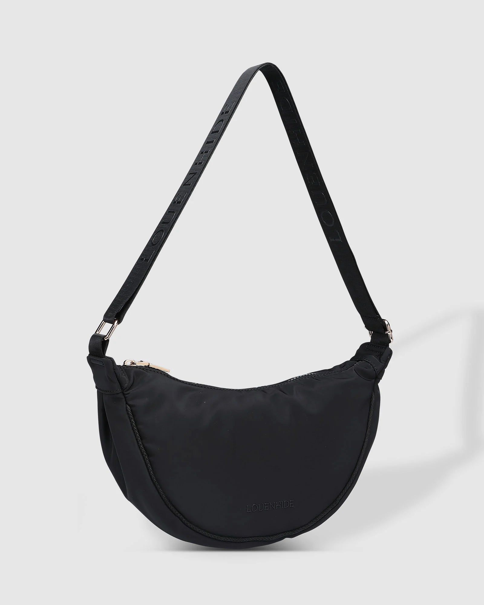 The Louenhide Sylvia Nylon Crossbody Bag is an on-trend style, featuring a modern crescent silhouette. From sunnies to car keys, you can conveniently organize your daily essentials in the two internal slip pockets without compromising on style. The soft nylon material adorned with the light gold hardware detailing, effortlessly elevates your minimal aesthetic. Crafted with comfort in mind, the adjustable sateen webbing guitar strap ensures you can customise the fit to your liking. Whether you're grabbing a coffee with the girls, hitting the city streets, or embarking on a shopping spree, the Sylvia Black is the perfect casual crossbody bag to elevate your look. For best results, please use a water-proofer to prevent stains or watermarks.