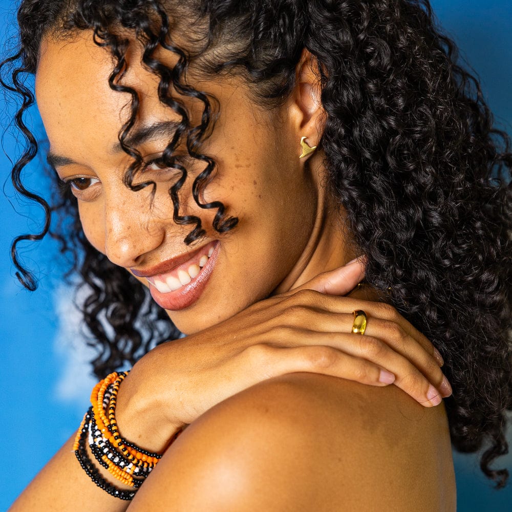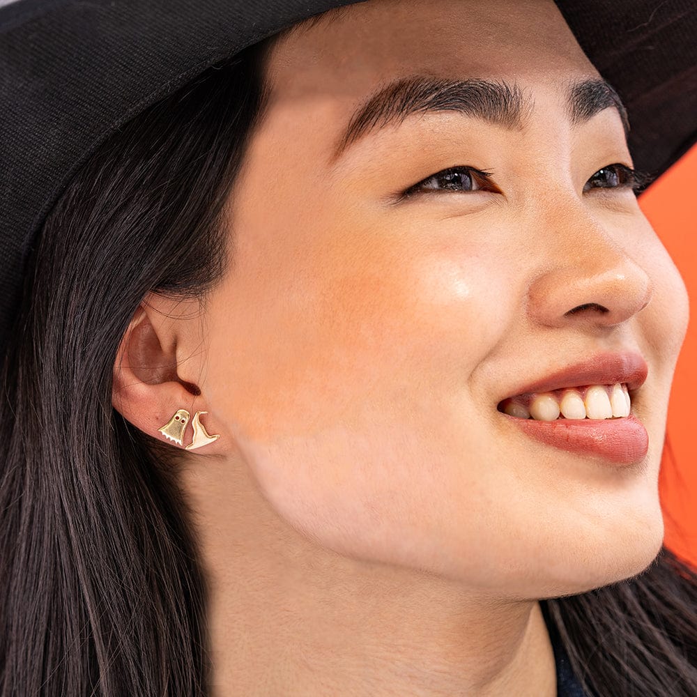 On one ear, a charming brass ghost dances and swirls, ready to haunt your everyday outfits with its free-spirited whimsy. Not to be outdone, a witchy witch hat commands attention on the other side, its 18k gold plating casting a spell of luxury and glamour. Together, they are the perfect blend of Halloween spirit and bohemian flair, and the accessory your jewelry collection has been dying for.